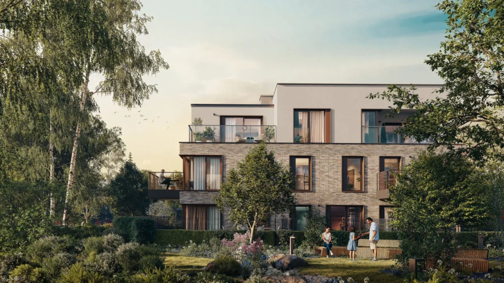Estetyka i wygoda przyświecały zespołowi projektantów. Na elewacje wybrali okładzinę o fakturze drewna oraz rozwiązania nawiązujące do cegły klinkierowej. Ponadczasowa, ciepła kolorystyka spodoba się najbardziej wymagającym – zaplanowaliśmy różne odcienie szarości, beżu i kolorów ziemi. Aby nadać lekkości bryłom budynków, balustrady balkonów będą szklane. Zachwyt mieszkańców i odwiedzających ich gości wzbudzą również części wspólne – strefy wejść czy hole. Zgodnie z najnowszymi trendami mieszkania będą ekologiczne – na osiedlu zamontujemy pompy ciepła.