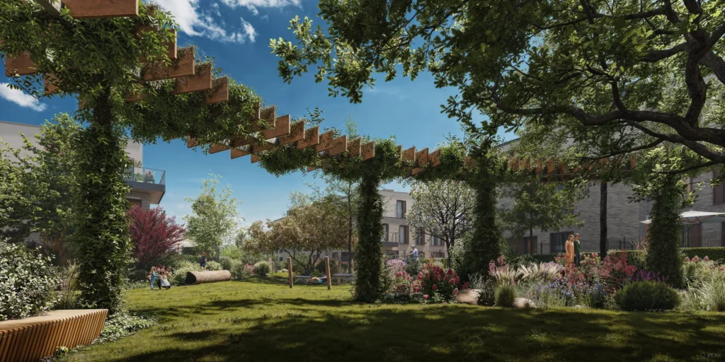 Tutaj architektura będzie współgrała z otoczeniem. Zaaranżujemy kilka otwartych dziedzińców z różnymi funkcjami rekreacyjnymi. Dwa z nich będą przeznaczone do spokojniejszej formy rekreacji – wypoczynku, lektury (miejsce wymiany książek), sąsiedzkich rozmów. Kolejny będzie zaś wyposażony w drewniane, ekologiczne place zabaw, miejsce piknikowe i urządzenia do ćwiczeń fizycznych. Całość dopełni sensoryczna ścieżka „bosych stóp” oraz ścieżki biegowe.